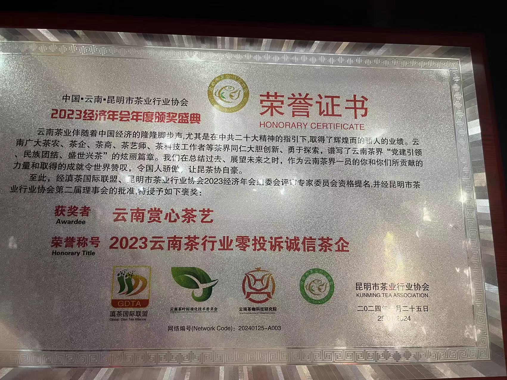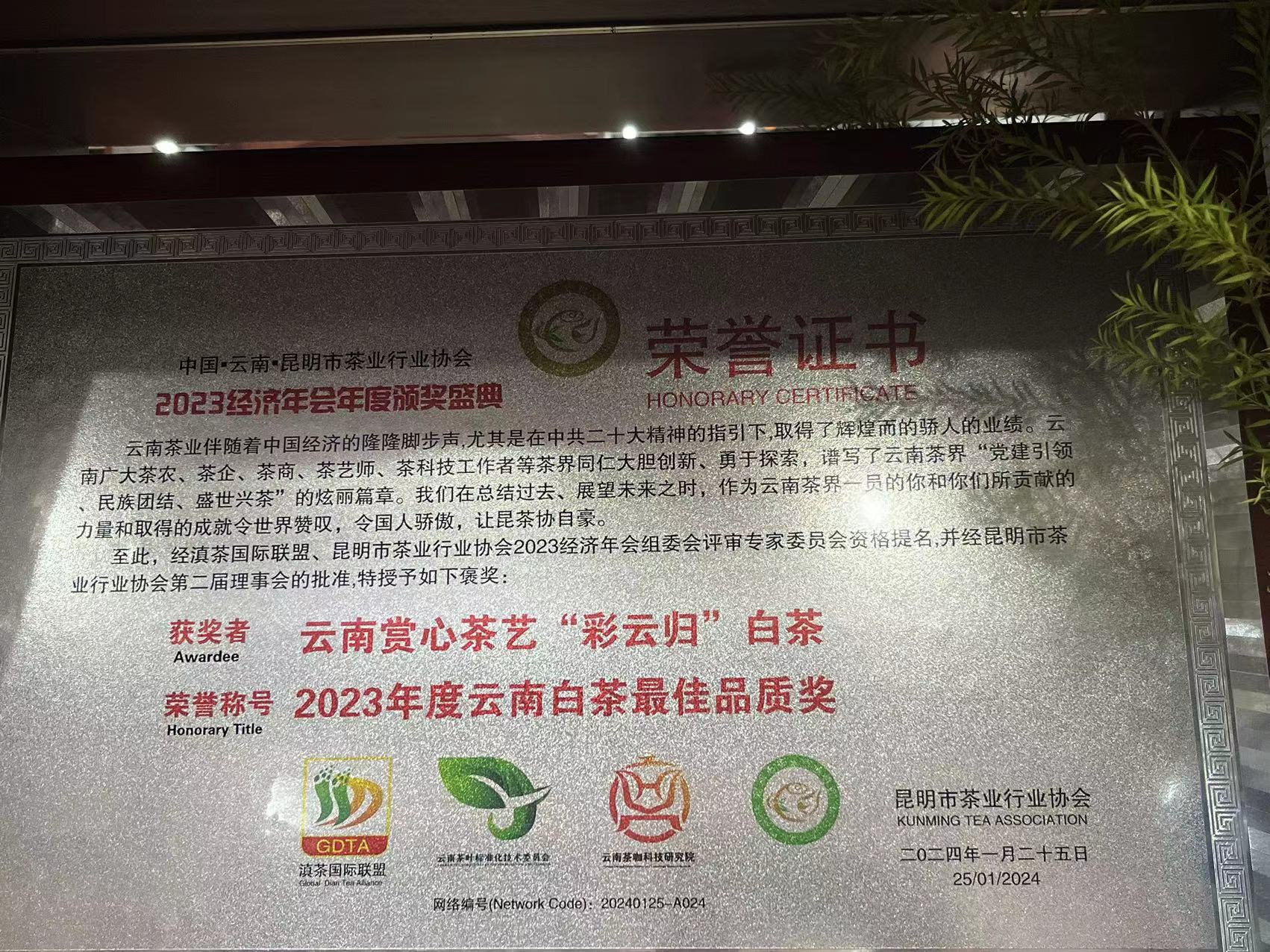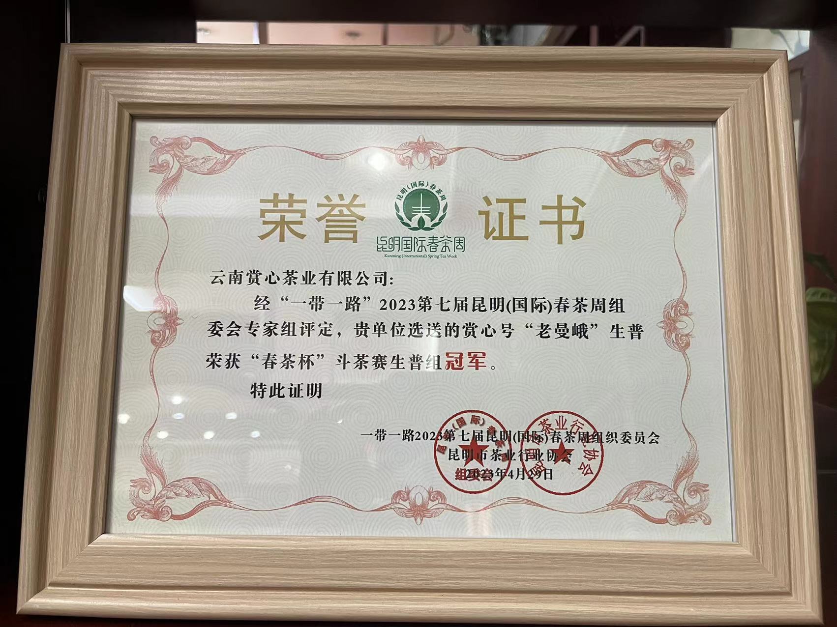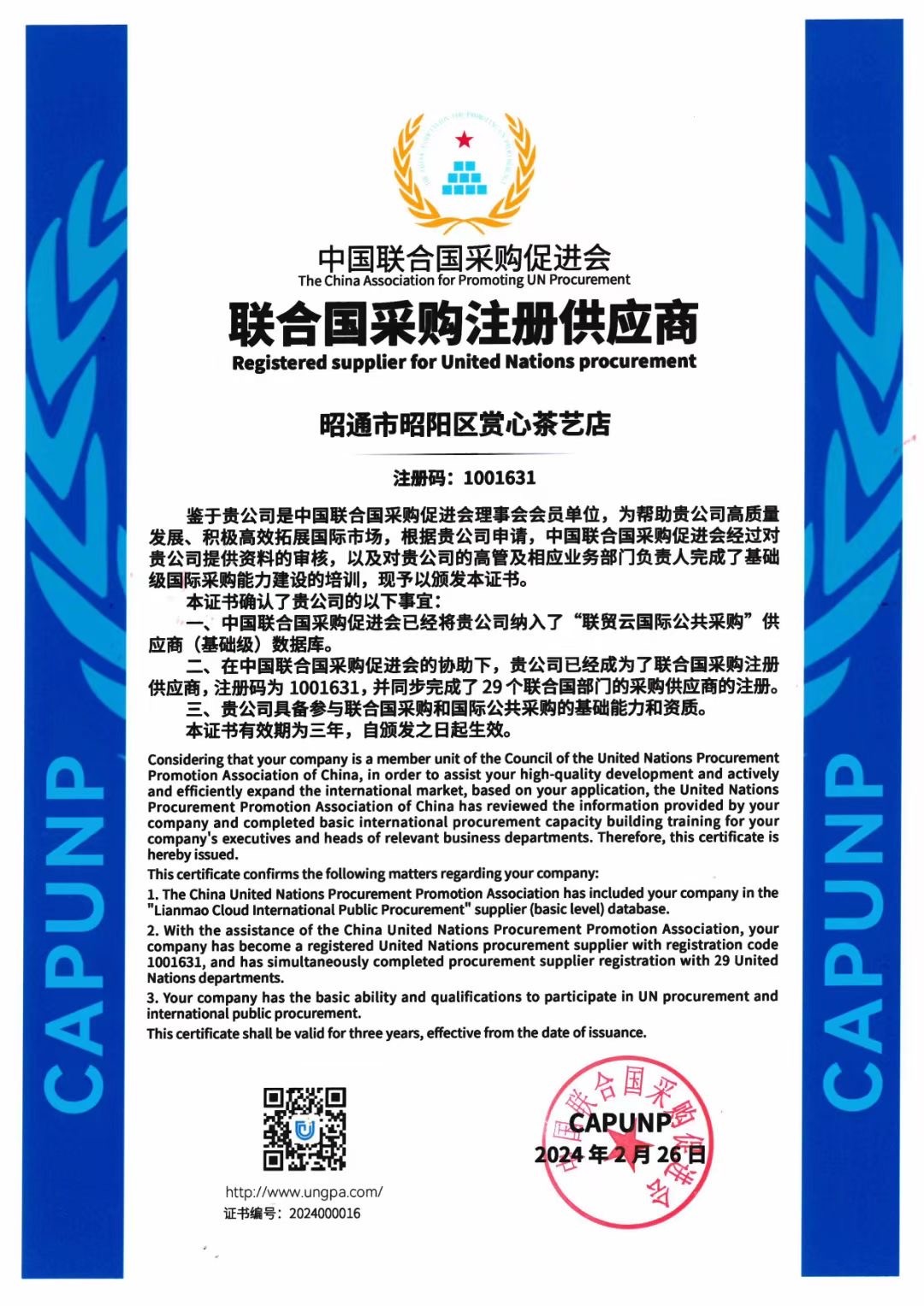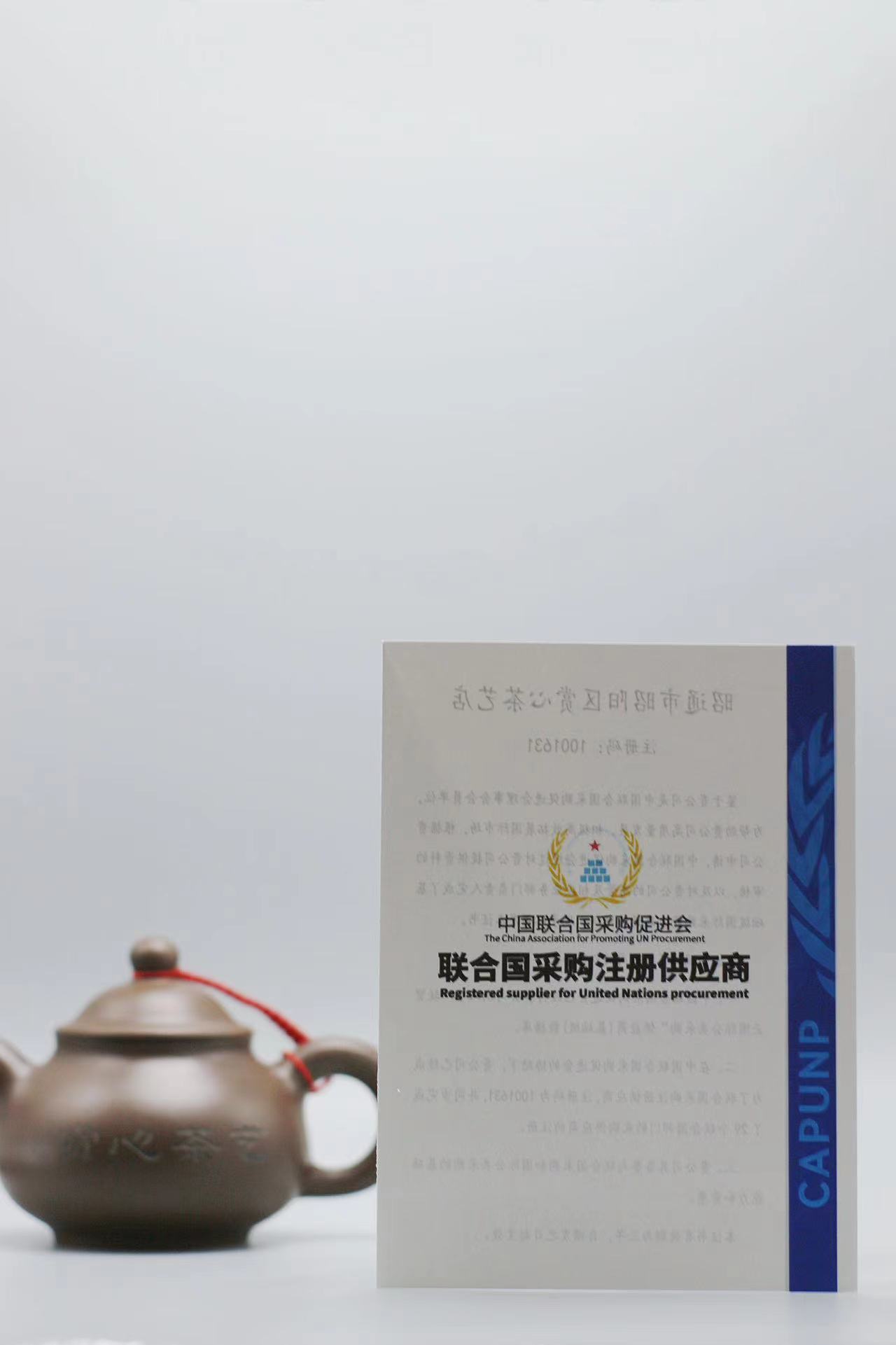 证书编号为:1001631,时效期为三年,且同步完成了29个联合国部门的采购供应商的注册!在赏心茶艺荣获“茶王”的《老班章》被中国茶叶博物馆馆藏的基础上,才有资格由茶行业协会向中国联合国采购促进会申请。